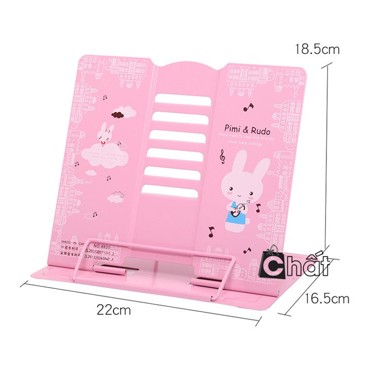 Có thanh chống phía sau với nhiều nấc giúp điều chỉnh khoảng cách từ sách tới mắt cho phù hợp, phía trước có thanh kẹp giữ sách