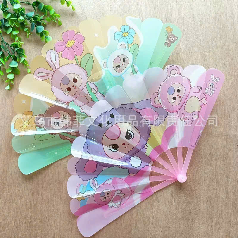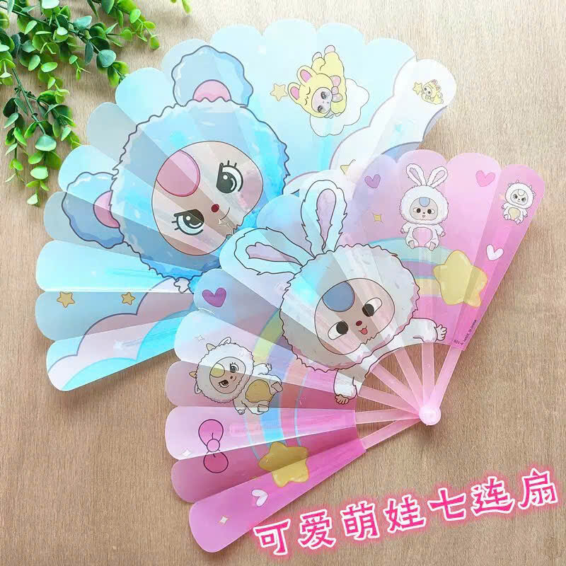 Đây là chiếc quạt cầm tay bảy cánh bằng nhựa với hình ảnh gấu con và thỏ hoạt hình dễ thương. Đây là phụ kiện nhỏ gọn và nhẹ, thích hợp để giữ mát trong thời tiết nóng bức.